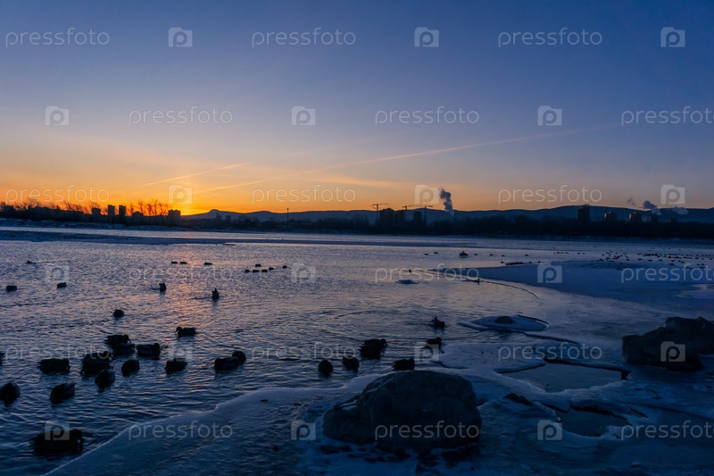 Зимнее морозное утро над Енисеем в центре Красноярска