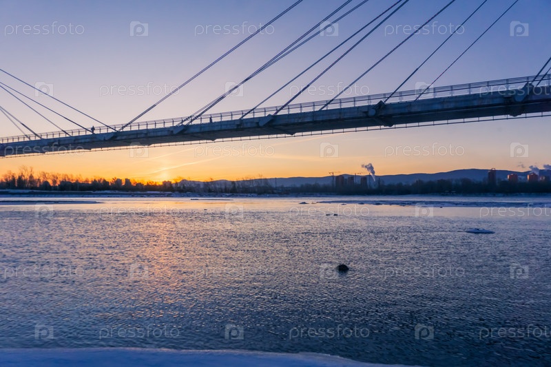 Зимнее морозное утро над Енисеем в центре Красноярска