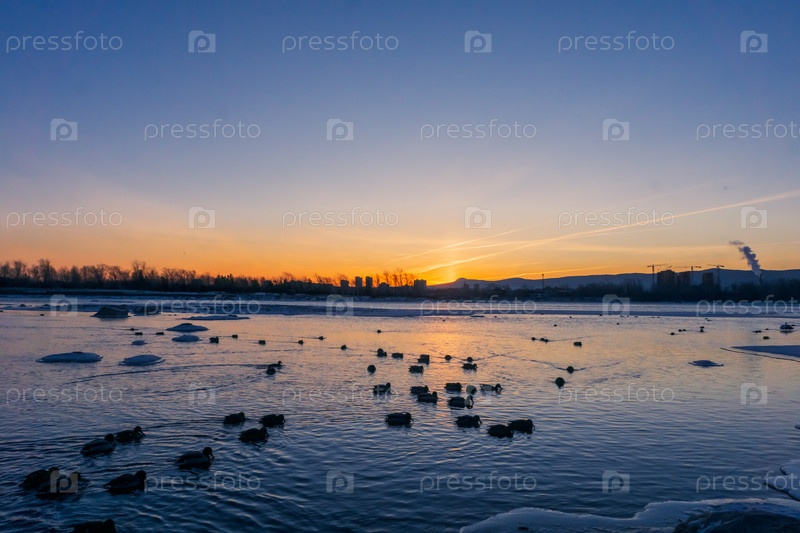 Зимнее морозное утро над Енисеем в центре Красноярска