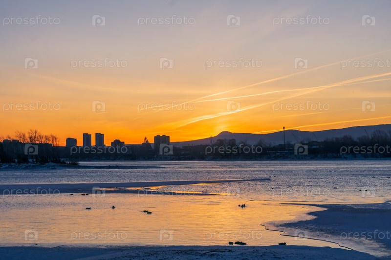 Зимнее морозное утро над Енисеем в центре Красноярска