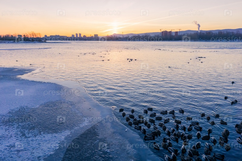 Зимнее морозное утро над Енисеем в центре Красноярска