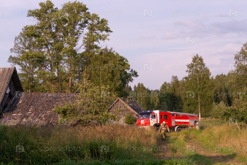 На место прибыли сотрудники пожарной службы. Пожарная машина на месте пожара. Пожар в деревне. Горят деревянные дома в селе. На месте предприятия промышленности работают сотрудники пожарной службы. Пожарная машина на месте пожара. Пожар в деревне. Горящие