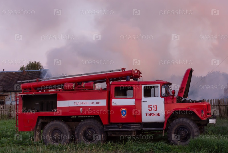 На место прибыли сотрудники пожарной службы. Пожарная машина на месте пожара. Пожар в деревне. Горят деревянные дома в селе. На месте предприятия промышленности работают сотрудники пожарной службы. Пожарная машина на месте пожара. Пожар в деревне. Горящие