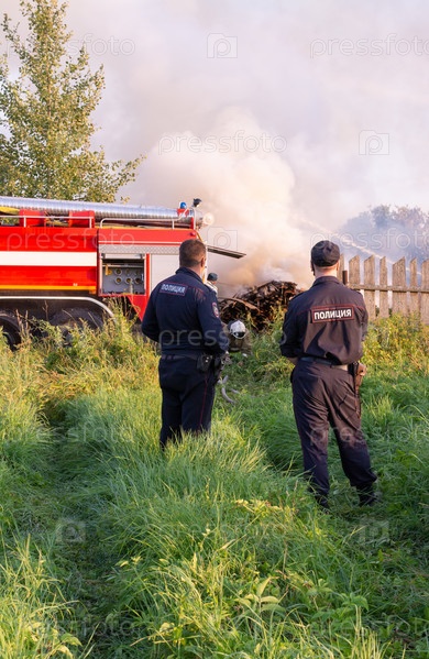 Россия, Тверская область, деревня Ранцево - июль 2021 года.На место пожара прибыли сотрудники полиции. Пожар в деревне. Чрезвычайная ситуация