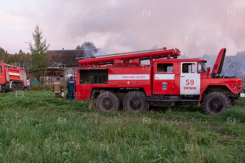 На место прибыли сотрудники пожарной службы. Пожарная машина на месте пожара. Пожар в деревне. Горят деревянные дома в селе. На месте предприятия промышленности работают сотрудники пожарной службы. Пожарная машина на месте пожара. Пожар в деревне. Горящие