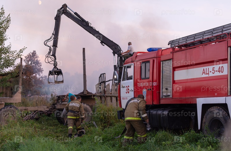 На место прибыли сотрудники пожарной службы. Пожарная машина на месте пожара. Пожар в деревне. Горят деревянные дома в селе. На месте предприятия промышленности работают сотрудники пожарной службы. Пожарная машина на месте пожара. Пожар в деревне. Горящие
