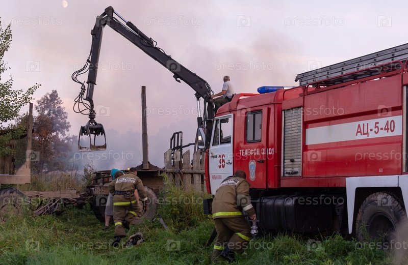 На место прибыли сотрудники пожарной службы. Пожарная машина на месте пожара. Пожар в деревне. Горят деревянные дома в селе. На месте предприятия промышленности работают сотрудники пожарной службы. Пожарная машина на месте пожара. Пожар в деревне. Горящие