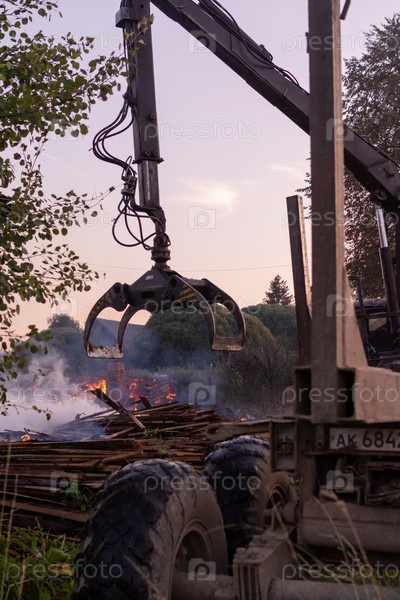 Работник фискарса демонтирует кучу досок на месте пожара, чтобы освободить подъезд к месту происшествия.Пожар в деревне. Горят деревянные дома в селе Ранцево Тверской области.A worker at fiskars disassembles a pile of boards at the site of the fire t