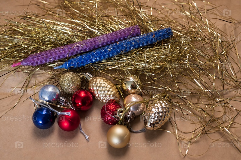 Новогодние украшения и свечи на фоне золотой мишуры