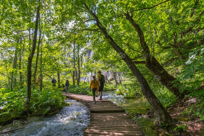 Лесной пейзаж с туристами и потоком воды. Национальный парк Плитвицкие озера, Хорватия