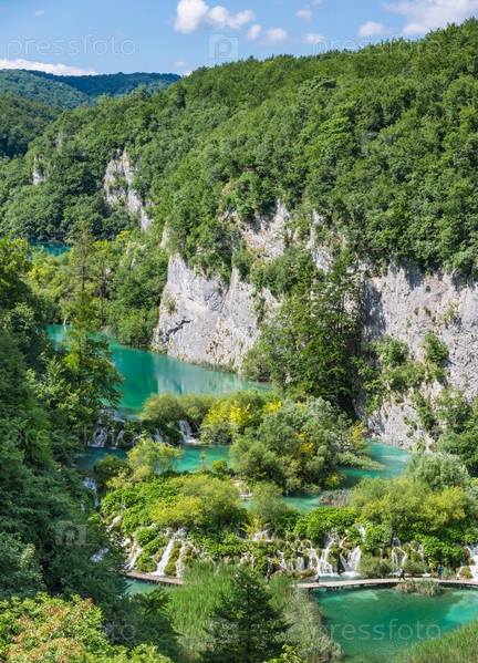 Вид на каскад водопадов сверху. Вертикальная рамка. Национальный парк Плитвицкие озера, Хорватия