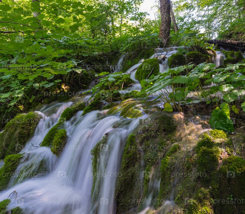 Красивый поток воды между растениями. Национальный парк Плитвицкие озера, Хорватия