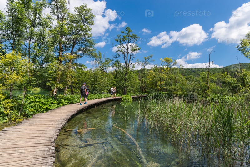 Дорожка с туристами на Плитвицких озерах. Солнечный день. Национальный парк Плитвицкие озера, Хорватия