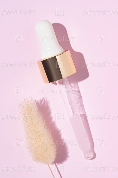 Крупный план пипетки с льющейся жидкой сывороткой и тенями на розовом фоне. Модная косметика с жесткими тенями