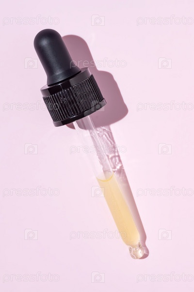 Пипетка для бутылок и жидкий желто-оранжевый ретинол или гель или сыворотка витамина С на розовом фоне