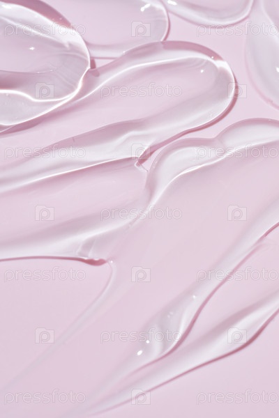 Косметический крем, прозрачная жидкая гелевая текстура сыворотки с микропузырьками на розовом фоне, концепция красоты