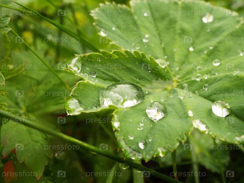 Капли дождя на листьях Манжетки летом