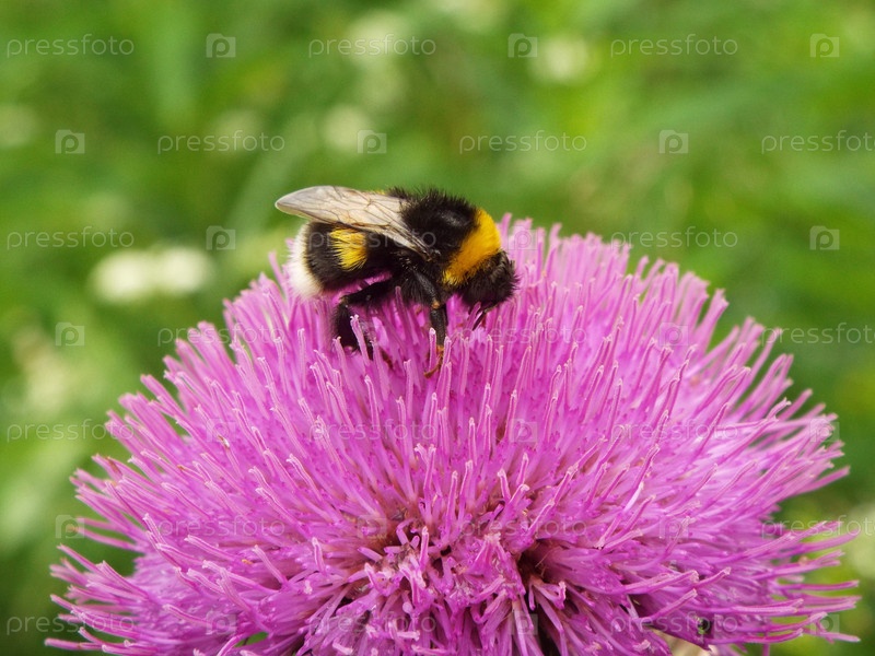 Шмель собирает нектар на цветке чертополоха