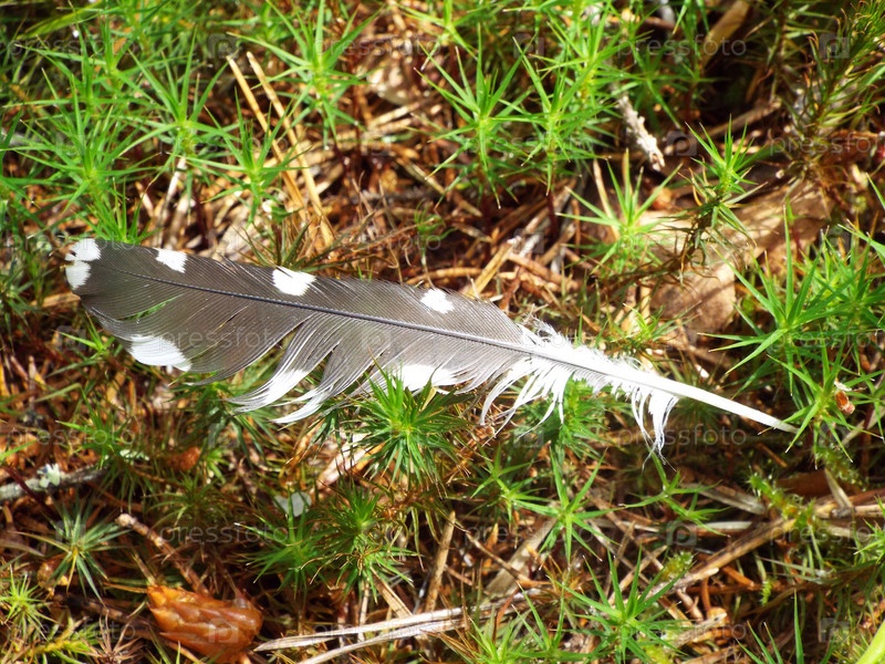 Перо дятла лежит на мхе в лесу