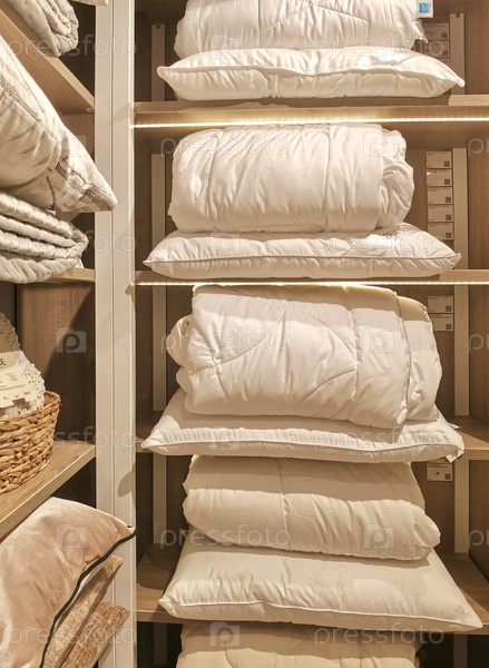 Полка магазина с белыми подушками и белыми одеялами из натурального хлопка