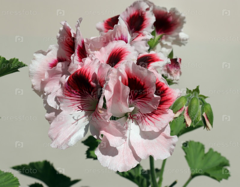 Оригинальные белые и красные цветы герани (королевская пеларгония) на светлом фоне