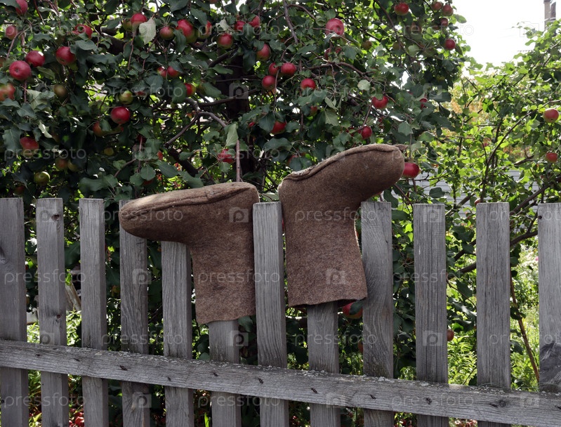 Валенки сушатся на деревянном деревенском заборе на фоне созревающих яблок
