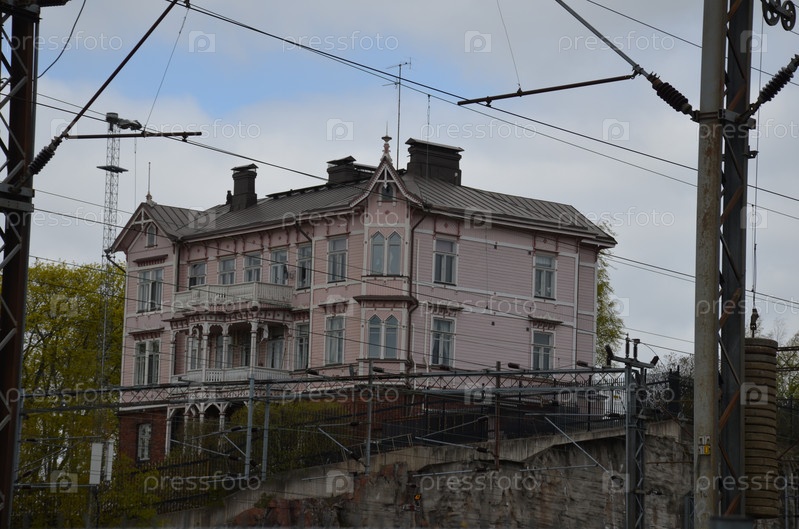 Деревянный розовый жилой дом в Хельсинки Финляндия на фоне проводов линии электропередачи