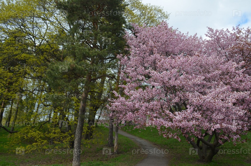 Пышный красивый цветущий куст розовой сакуры (вишни) в весеннем парке