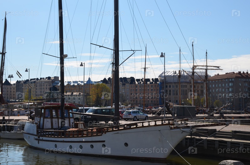 Вид на набережную Хельсинки: историческая застройка, пришвартованные кораблики, лодки и яхты