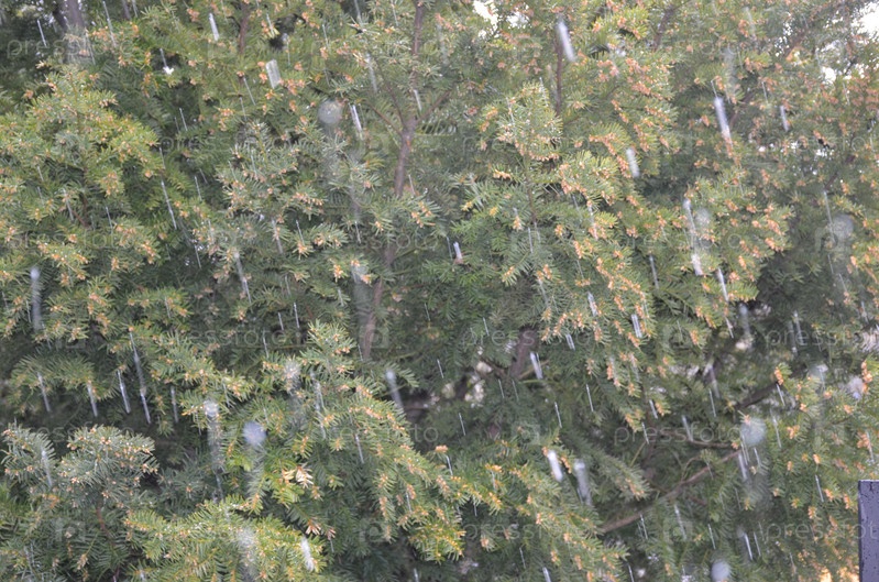 Капли снега с дождем на фоне зеленых хвойных деревьев: фоновое изображение