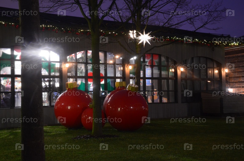 Рукотворный остров Новая Голландия в Санкт-Петербурге зимним вечером украшенный к новогодним праздникам, огромные красные елочные шары