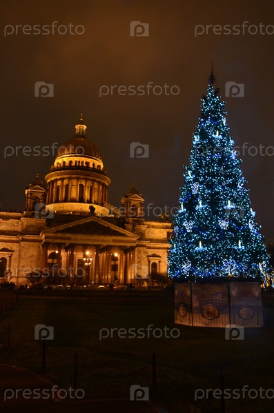 Новогодняя ель у Исаакиевского собора в Санкт-Петербурге зимним вечером