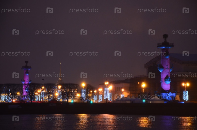 Стрелка Васильевского острова украшенная к Новому году, Ростральные колонны