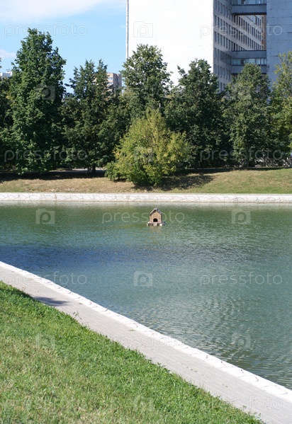 Пруд в городском парке в сухой солнечный летний день