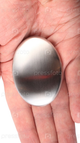 Рука с мылом из нержавеющей стали изолирована на белом фоне