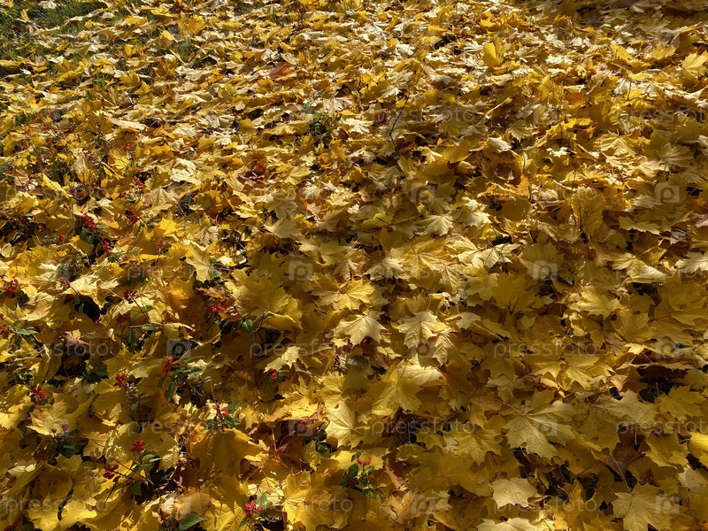 Ковер из желтых кленовых листьев в осенний сухой солнечный день