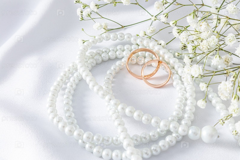 Два золотых обручальных кольца на белом атласном фоне с шикарными жемчужными бусинами и веткой гипсофилы. Вид сверху. открытка. Макет для дизайна. приглашение