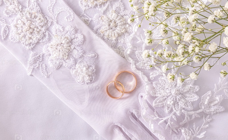 На шикарных расшитых бисером перчатках невесты, расшитых бисером и пайетками, лежат два золотых обручальных кольца. Вид сверху. Атласный белый фон