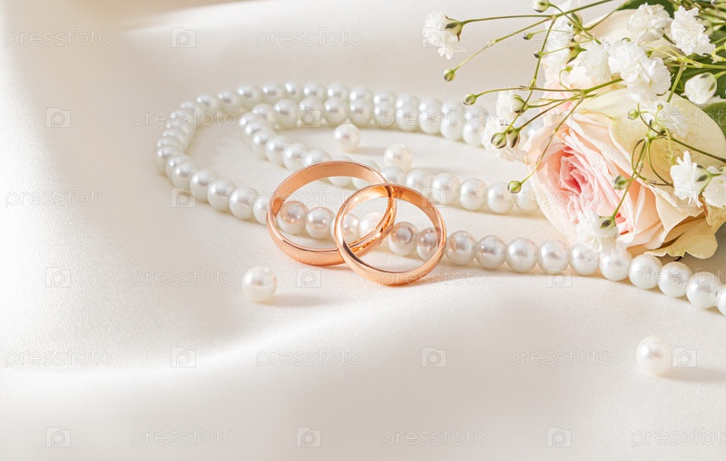 Два золотых обручальных кольца лежат на жемчужных бусинах и нежном бежевом атласном фоне. Свадебный букет. Дизайнерский макет. открытка. приглашение. Место для копирования