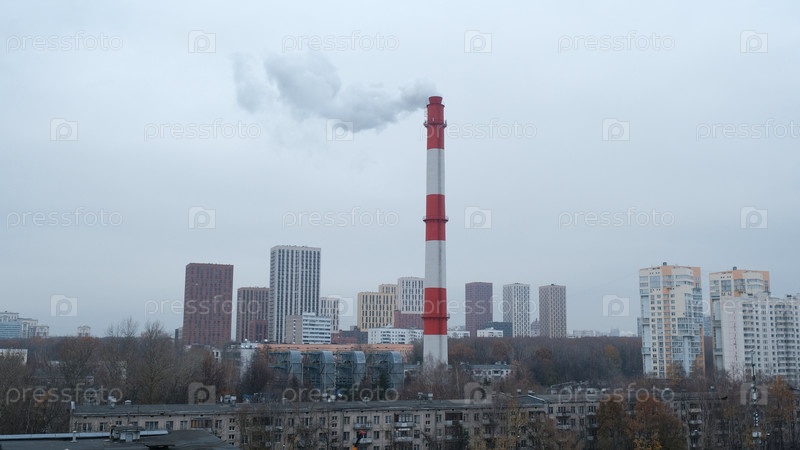 Высокий оранжево-белый дымоход, из которого идет дым, стоит посреди города