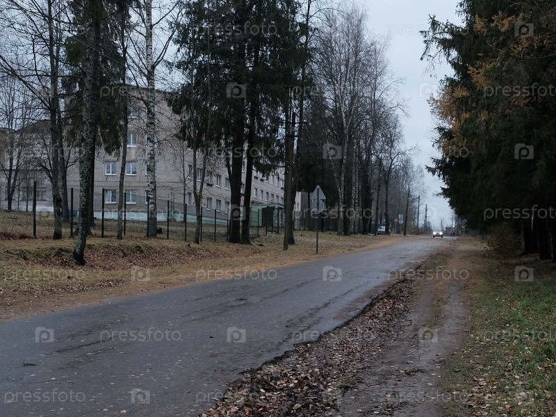 Мокрая асфальтированная дорога после дождя, на стороне которой желтые опавшие листья
