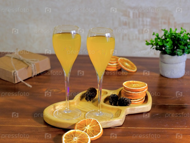 На деревянном подносе стоят стаканы с коктейлем мимозы, шампанским и апельсиновым соком