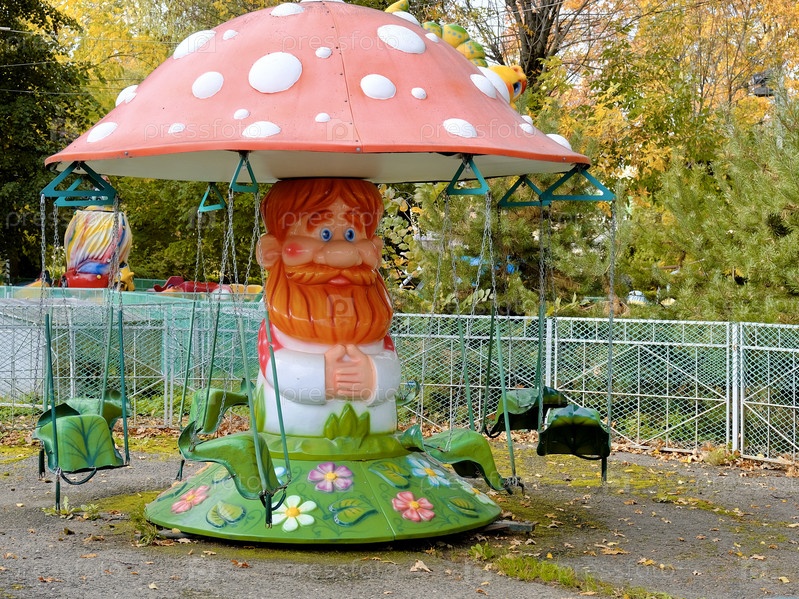 Пустые Необычные яркие детские качели в осеннем городском парке