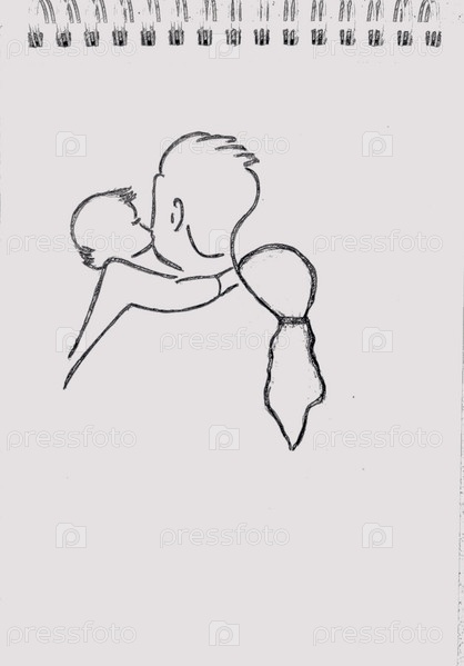 Карандашный рисунок на руках у мужчины - маленькая девочка, которая его целует, а на его плече - голова девочки