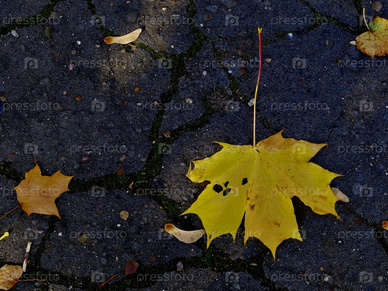 На сером потрескавшемся асфальте лежит большой желтый кленовый лист и несколько маленьких