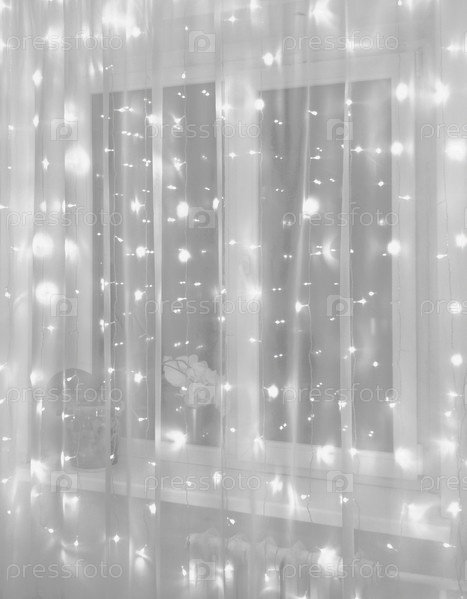 На окне висит белый тюль, за которым переливается рождественская гирлянда