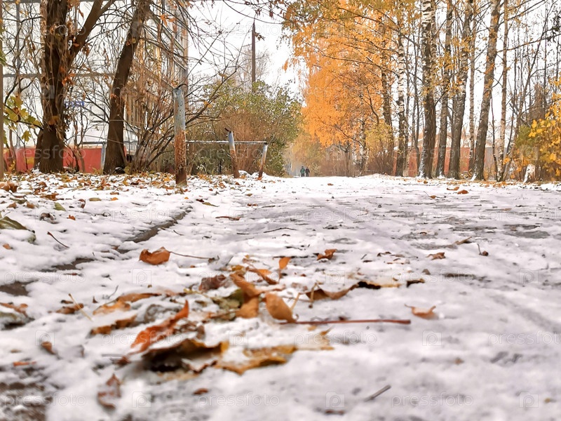 На тропинке на желтых осенних листьях лежит первый снег, вдали береза, покрытая желтой листвой