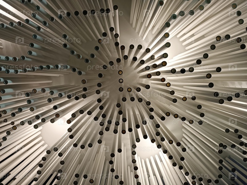 Потолок отделан пластиковыми трубами