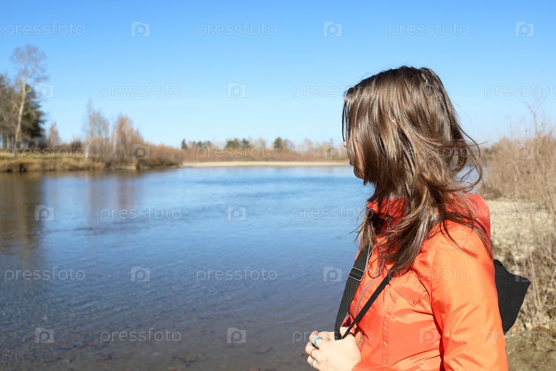 Девочка-подросток в оранжевой куртке на фоне осенней реки