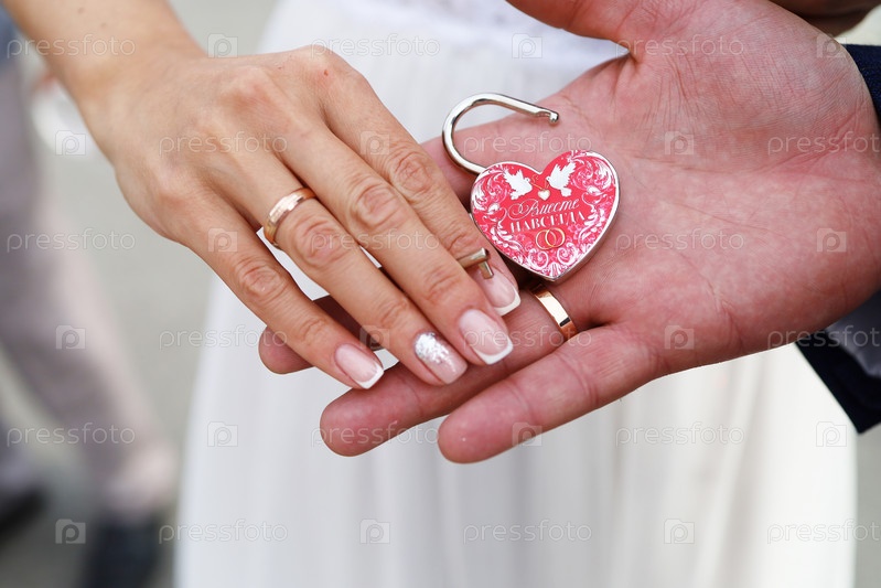 Замок на ключ в руках молодоженов